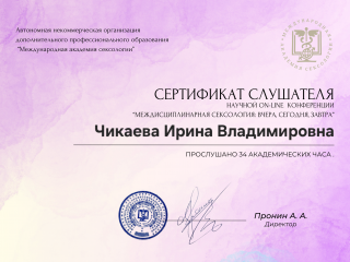 - Аспекты сексологии при изучении генеза сексологических нарушений психолого-сексологического спектра, а также изучение мер по предупреждению возникновения инфекций, передающихся преимущественно половым путем (двухгодичная программа обучения в АНО ДПО "Международная академия сексологии", 3000 ак.часов, с квалификацией сексолог-консультант).