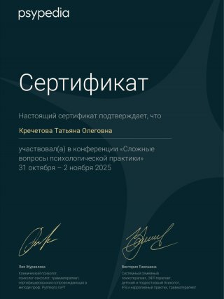 Закончила Восточно-Европейский институт психоанализа в 2020 году. Обучалась по программе "Психоанализ и консультативная психология". Теоретическая подготовка - 1273 часа.