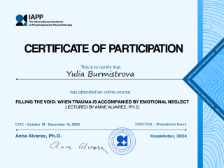Я создаю для вас безопасное и поддерживающее пространство, где вы можете быть собой, говорить открыто и постепенно разбираться в своих чувствах, желаниях и внутренних конфликтах.