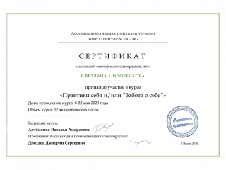 - Состою в Российской Психотерапевтической Ассоциации, Российском Обществе Человеко-Центрированного Подхода.